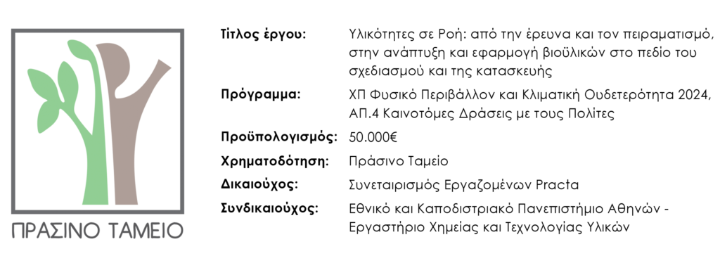 Το έργο χρηματοδοτείται από το Πράσινο Ταμείο στα πλαίσια του προγράμματος Καινοτόμες Δράσεις με τους Πολίτες 2024 και υλοποιείται σε συνεργασία με το Εργαστήριο Χημείας και Τεχνολογίας Υλικών του Εθνικού Καποδιστριακού Πανεπιστημίου Αθηνών.